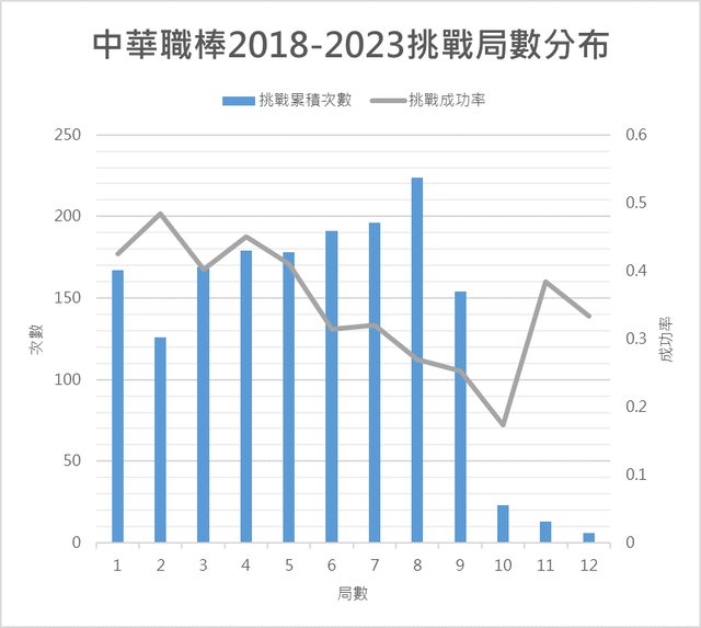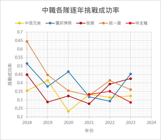 從近五年的數據來看 基本趨勢是到越後段局數使用挑戰的比例越高 如果太早把挑戰用完, 很可能到後面重要關頭反而沒得用 不過挑戰成功率是逐局下降的 這也表示有不少教練應該是抱著 「挑戰次數不用白不用」的態度 在後段局數或許可以當作一個拐氣招數? 各隊的逐年挑戰成功率 https://i.imgur.com/ZFhQ4di.png