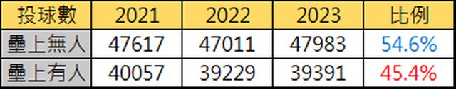 近三年的中職數據來看(表三),平均投手有45.4%的用球數是壘上有人時投出,平均每場
