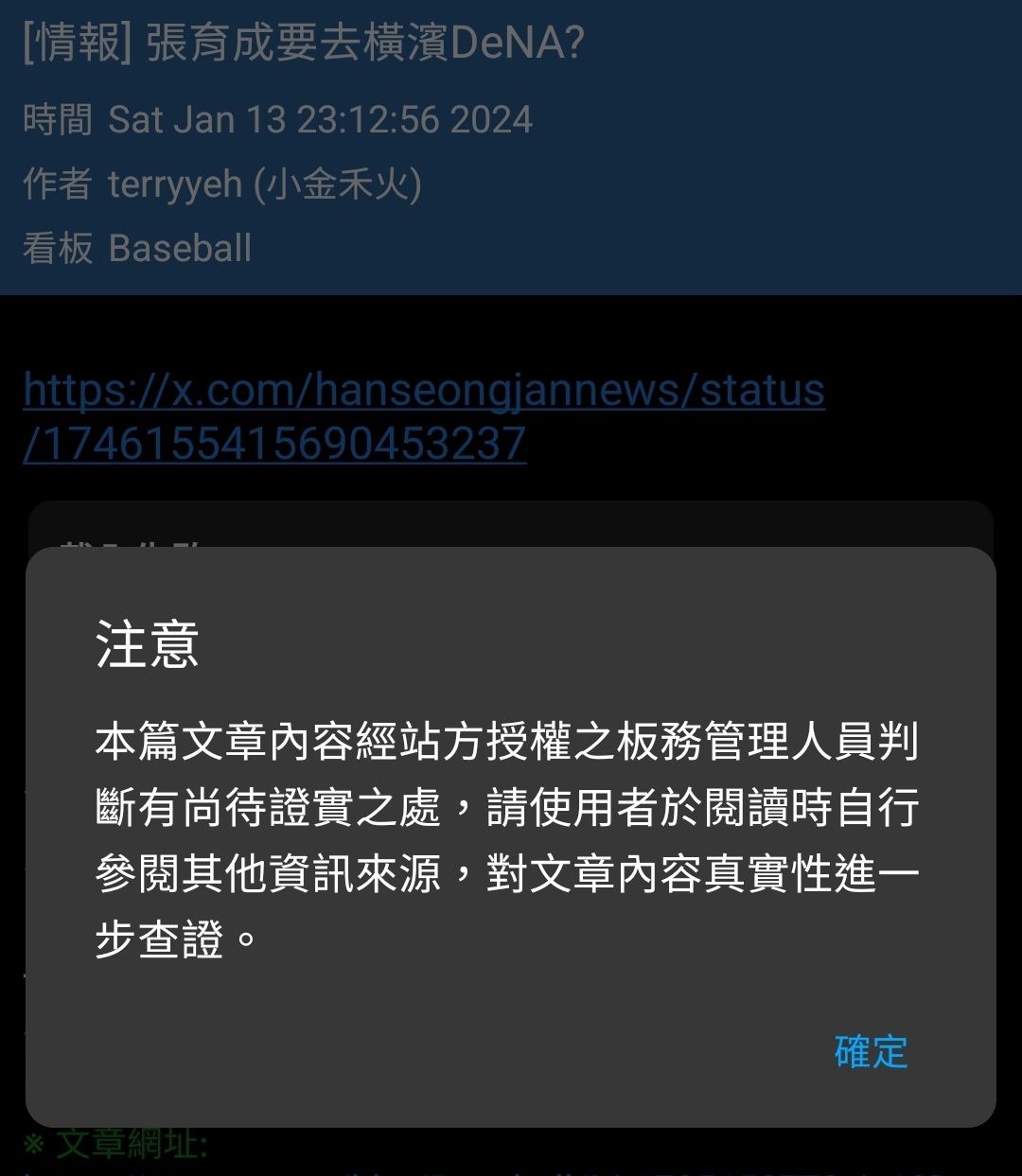 噓 jyunwei: 第一次看到發假消息發到被系統警告的 01/14 10:06