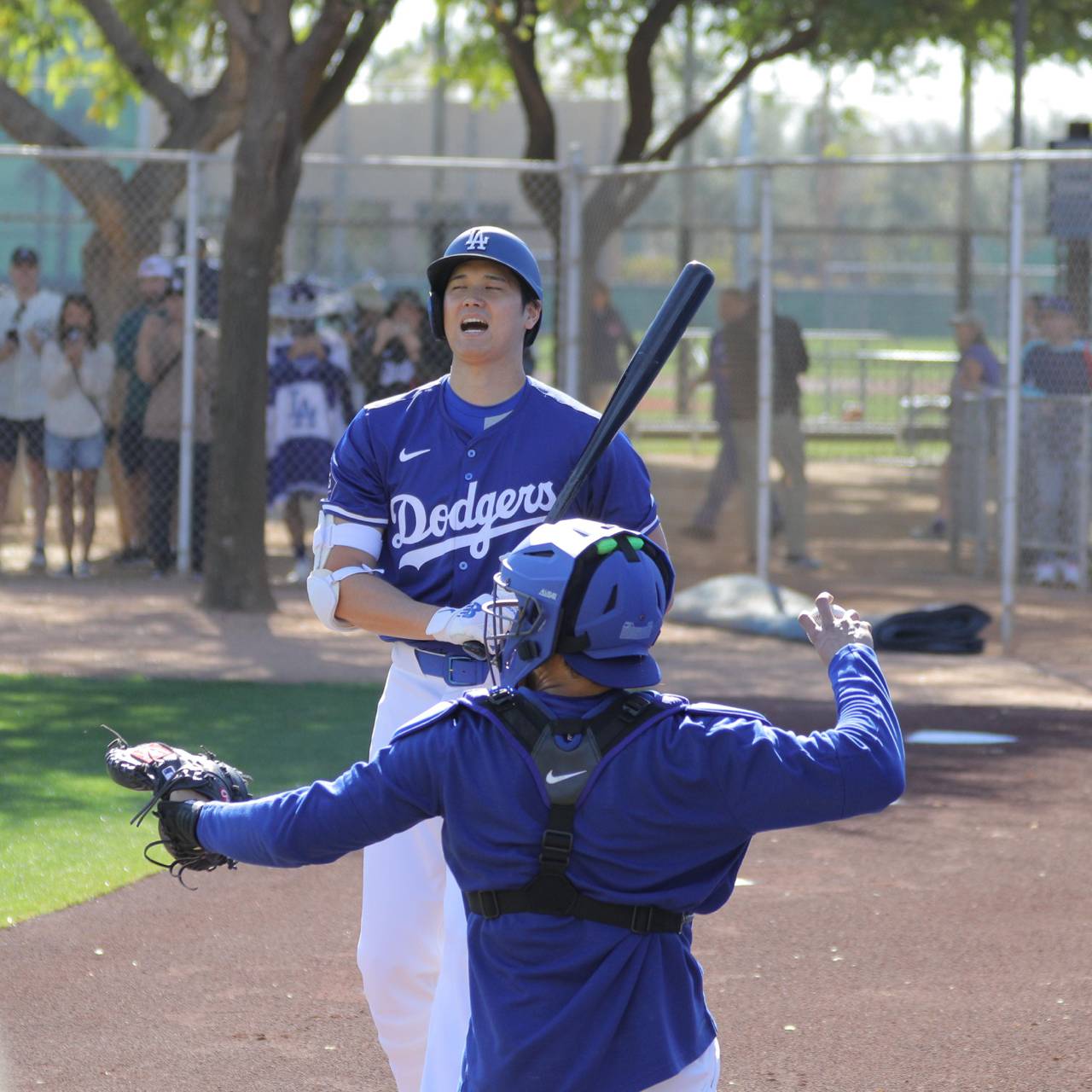 道奇總教練羅伯斯(Dave Roberts)也在一旁觀看大谷的訓練,他還開玩笑說:「翔平,