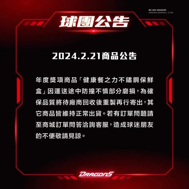 年度獎項商品「健康餐之力不鏽鋼保鮮盒」因運送途中防撞不慎部分磨損,為確保品質將