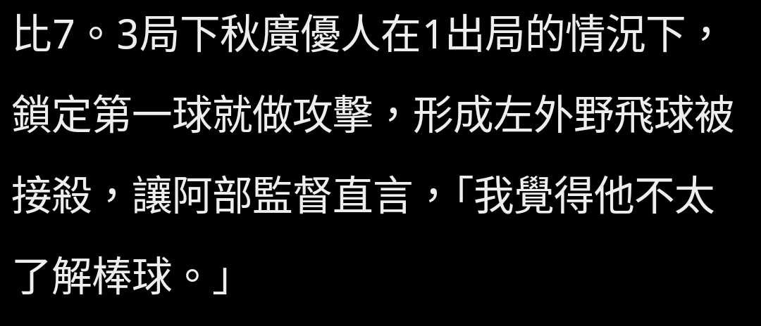 → cena0605: 秋廣之前就遲到兩次了 早就被阿部釘了 02/25 12:16