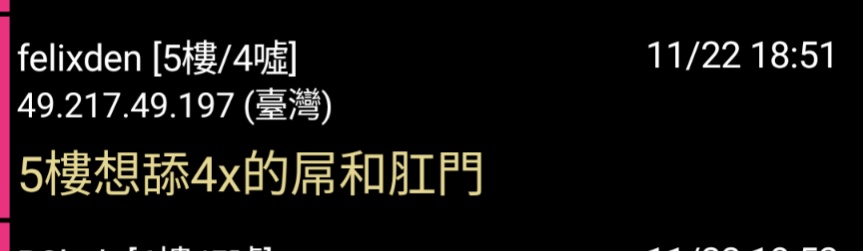 噓 felixden: 5樓想舔4x的屌和肛門 49.217.49.197 11/22 18:51