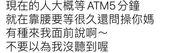 ※ 八卦板務請到 GossipPicket 檢舉板實名詢問 ※ a.張貼問卦請注意,充實文章內容、是否有專板本板並非萬能問板 ※ b.一天只能張貼 "三則" 問卦,自刪及被刪也算三篇之內 ※ 超貼者將被水桶,請注意! ※ c.本看板嚴格禁止政治問卦發文問卦前請先仔細閱讀相關板規 ※ d.未滿30繁體中文字水桶1個月 未滿20繁體中文字水桶2個月 未滿10繁體中文字水桶3個月,嚴重者以鬧板論,請注意! ※ (↑看完提醒請刪除ctrl + y) 剛才看到朋友的臉書 她說她提款機用了5分鐘被後面的人罵她很不爽 很奇怪耶,提款機爲何需要五分鍾 而且通常多5分鐘,都不只5分鐘 為何女人動作慢都要理直氣壯? https://i.imgur.com/wwTk240.jpg