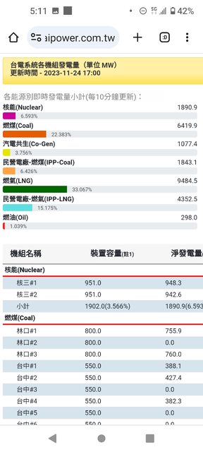 今天的風力發電來到1944.7MW,占比6.78%,是我看過最高的一次發電量,超越核電的189