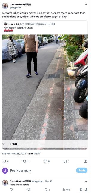 台灣的城市設計明確地表明,汽車和機車比行人或騎單車的人更重要,行人或騎單車的人