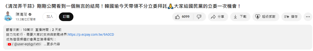 → MadAngel: 笑死人了 自己去看陳清茂YT 韓粉動向220.141.172.160 11/26 14:04