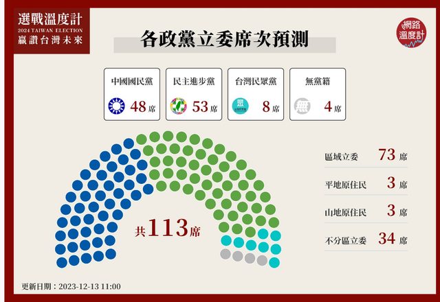 灣未來」預測,13日最新各政黨立委席次預測,國民黨取得48席、民進黨拿下53席、民眾
