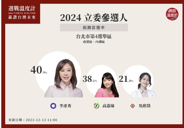 日台北市第四選區(內湖、南港)參選人當選率預測,國民黨參選人李彥秀當選率40.9%