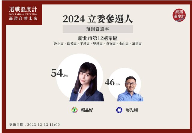 、貢寮)參選人當選預測,民進黨參選人賴品妤當選率54%,贏過國民黨立委參選人廖先