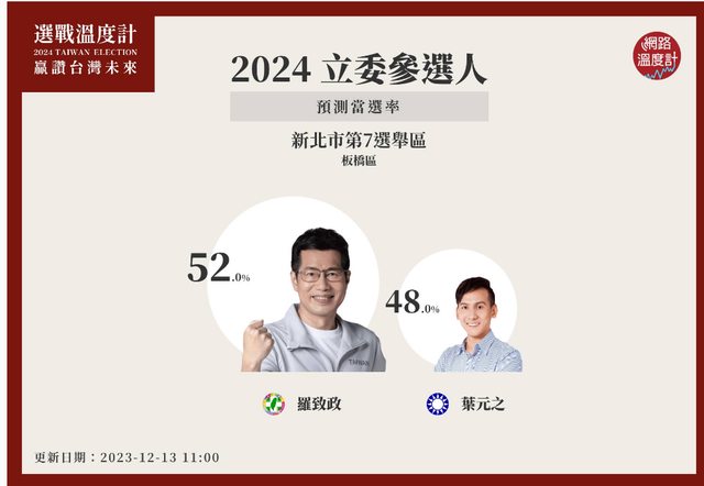 當選率預測,民進黨立委參選人、現任立委羅致政的52%,贏過國民黨參選人葉元之當選