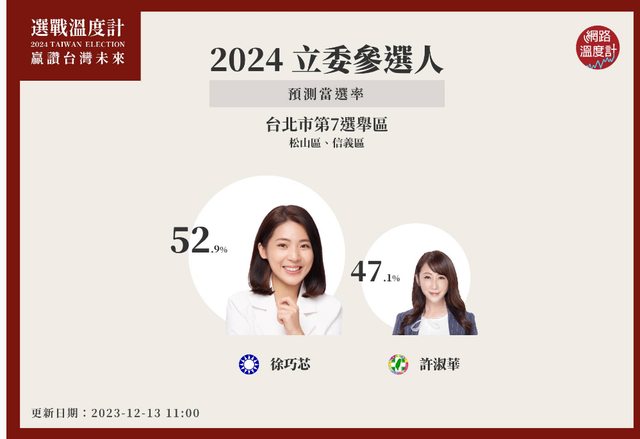 南松山)參選人當選預測,國民黨參選人徐巧芯當選率52.9%,贏過民進黨立委參選人許