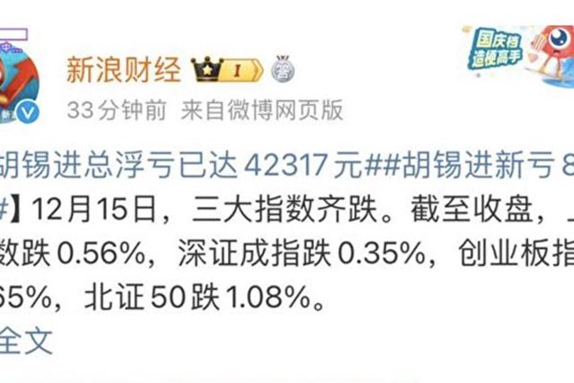10月18日,胡錫進發文稱,新增虧損6,774元,總浮虧首次突破3萬元。