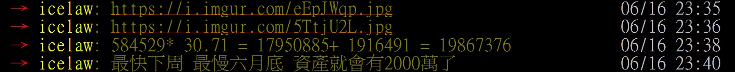 → icelaw : 我的資產從6/16到7/1 剛半個月,增加了82萬台幣 07/02 19:20