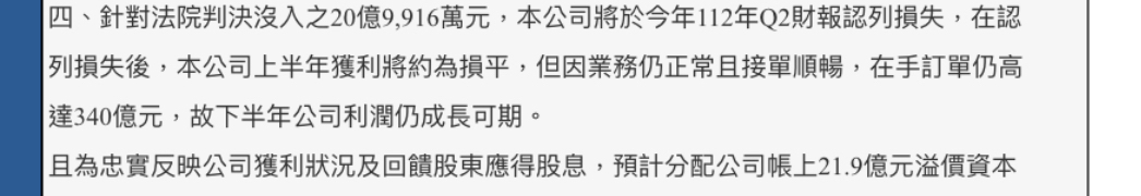 1. 標題:中興電收到判決書之說明 2. 來源:公開資訊觀測站 3. 網址:https://mops.twse.com.tw/mops/web/t05sr01_1 4. 內文: 1.法律事件之當事人:江義福 2.法律事件之法院名稱或處分機關:臺灣高等法院臺中分院 3.法律事件之相關文書案號:111年度金上訴字第75號 4.事實發生日:112/07/21 5.發生原委(含爭訟標的): 一、當事人之律師於今日收到判決書正本,依證券交易法第171條第1項第3款,定當事人 處有期徒刑4年;依刑法第339條,定當事人處有期徒刑4年6月。應執行有期徒刑5年10月 二、本公司所得新台幣20億9,916萬元沒收。 6.處理過程:當事人及本公司將於收到本案判決書後,與律師研議後續處理方向及相關 事宜。 7.對公司財務業務影響及預估影響金額: 針對本案法院判決沒入之20億9,916萬元,本公司已於110年依據律師意見認列損失 85,122千元,餘 2,014,038千元,於今年112年Q2財報亦已全數認列完畢。本公司經 此事件對財務影響、但對業務之承接與公共工程投標資格並無影響,一切營運正常。 8.因應措施及改善情形: 為保障公司股東權益,2023年股利將仍依預算發放。本公司於2022年即自主公開永續 報告書並於2023年進行碳盤查,在2023年7月更積極引進新規ISO37001,以宣示公司為 公司治理之前導者。 9.其他應敘明事項(若事件發生或決議之主體係屬公開發行以上公司,本則重大訊息同時 符合證券交易法施行細則第7條第2款所定對股東權益或證券價格有重大影響之事項):無 -- ※ 發信站: 批踢踢實業坊(www.ptt.org.tw), 來自: 223.137.69.28 (臺灣) ※ 文章網址: https://www.ptt.org.tw/Stock/M.1689922652.A.131