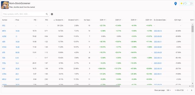再來用股息殖利率排序, 目前殖利率最高的個股竟然是這次銀行危機已經倒閉的FRC銀