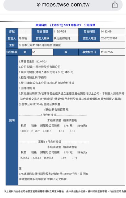 1. 標題:5871 中租-KY 更正公告本公司112年6月自結合併損益 2. 來源:公開資訊觀測站 (公司名、網站名) 3. 網址: https://reurl.cc/DAE0zj (請善用縮網址工具 ) 4. 內文: 圖: https://i.imgur.com/wIzgwNy.png