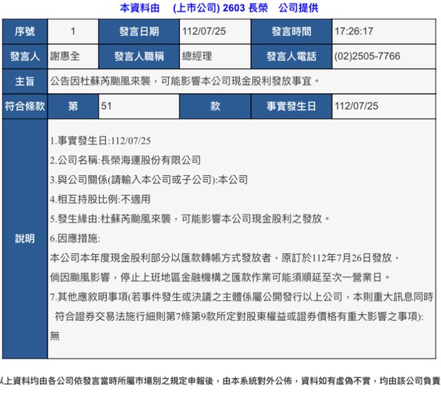 說明 1.事實發生日:112/07/25 2.公司名稱:長榮海運股份有限公司 3.與公司關係(請輸入本公司或子公司):本公司 4.相互持股比例:不適用 5.發生緣由:杜蘇芮颱風來襲,可能影響本公司現金股利之發放。 6.因應措施: 本公司本年度現金股利部分以匯款轉帳方式發放者,原訂於112年7月26日發放, 倘因颱風影響,停止上班地區金融機構之匯款作業可能須順延至次一營業日。 7.其他應敘明事項(若事件發生或決議之主體係屬公開發行以上公司,本則重大訊息同時 符合證券交易法施行細則第7條第9款所定對股東權益或證券價格有重大影響之事項): 無 -- ※ 發信站: 批踢踢實業坊(www.ptt.org.tw), 來自: 111.71.213.53 (臺灣) ※ 文章網址: https://www.ptt.org.tw/Stock/M.1690278238.A.281