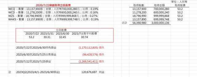 來說說小弟看法 緯創今公布出清立訊持股,總虧損約55億元,然同時也公告截至30/6/2023已提列11.71億 元人民幣,於3q23只需提列9650萬人民幣(台幣4.25億元) 緯創於3q20投資立訊,之後就每季得依股價波動認列金融評價利益或損失。 觀察過去簡單新聞可以查到的分別於 3q21提列損失22.56億元 1q22提列損失43.5億元、 1q23提列損失3.61億元、 而此次重訊所說的是 截至30/6/2023""累計已提列""11.71億元人民幣,約51.3億元, 上面那些早超過了,表示有時候立訊股價反彈,評價利益就會變正的 過去的已發生已公告,我們現在就要來討論還沒公告的和未來的 未來的部分公司已告訴你就是只剩下3Q23:只需提列9650萬人民幣(台幣4.25億元) 那還沒公告的呢?就是2Q23 2Q23怎麼估算呢? 其實從每一季的評價來簡單推算,3/31/2023立訊收盤價是30.31 而今日的全額虧損平均股價是用30.74元 所以整個2Q23在立訊的金融資產評價利益為""正數"" 有錯歡迎大家指正,市場耳語、解釋多樣化 還是要多看內文,才不容易被誤導唷 感覺很多人還是搞不懂邏輯在哪 舉個例好了 你在100元買進A股票好了 但你每一季季底作帳任損益 第一年股價101,所以你認列1元獲利 第二年股89,評價基礎變101,所以你認列12元虧損 第三年股價剩90元,於是你把它整個賣出認損了,算一算你這筆投資總共賠了10元 但是在會計每季的季報上已經逐季認列了,所以你在此時此刻你只需認列第三年的盈虧 也就90-89=1元,第三年這筆投資相較於第二年是回升(獲利)的, 但是你在這筆投資你卻是總共虧了10元(這就是公告總虧損的意思) 回到緯創、立訊 1Q23就像上面的例子第二年,對比4Q22的立訊股價,所以2Q23對比基礎就是1Q23 他就已經告訴你總共虧損多少了,簡單拿立訊股價就可以看的出來 去年九月後立訊股價基本就是一個區間走,過去也幾乎認列虧損了 那為何3Q23還要認列虧損呢? 因為30.74股價低於6/30/2023的32.45阿 如果再不懂,最後用一個數字來證明就知道 四家公司股數分別為13157890、18796990、11278200、13157900 共56390980股 32.45-30.74=1.71 1.71*56390980=9643 公司公告是 9650 剩下就是手續費、稅....一些必要成本 感謝網友F大提供更簡單明瞭的資訊 https://i.imgur.com/G7jDPwm.jpg