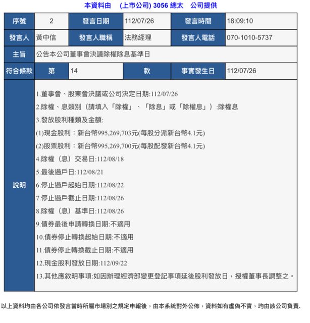 1.董事會、股東會決議或公司決定日期:112/07/26 2.除權、息類別(請填入「除權」、「除息」或「除權息」):除權息 3.發放股利種類及金額: (1)現金股利:新台幣995,269,703元(每股分派新台幣4.1元) (2)股票股利:新台幣995,269,700元(每股配發新台幣4.1元) 4.除權(息)交易日:112/08/18 5.最後過戶日:112/08/21 6.停止過戶起始日期:112/08/22 7.停止過戶截止日期:112/08/26 8.除權(息)基準日:112/08/26 9.債券最後申請轉換日期:不適用 10.債券停止轉換起始日期:不適用 11.債券停止轉換截止日期:不適用 12.現金股利發放日期:112/09/22 13.其他應敘明事項:如因辦理經濟部變更登記事項延後股利發放日,授權董事長調整之。 -- ※ 發信站: 批踢踢實業坊(www.ptt.org.tw), 來自: 111.71.212.8 (臺灣) ※ 文章網址: https://www.ptt.org.tw/Stock/M.1690370819.A.633