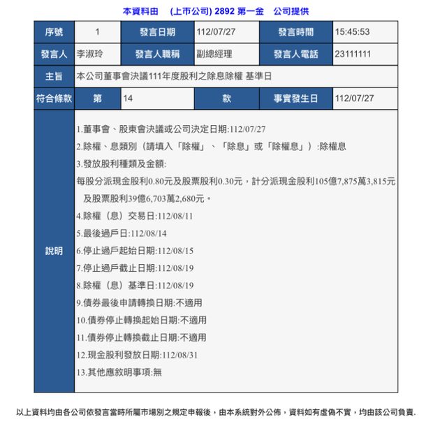 標題[情報] 2892 第一金 公告除權息基準日