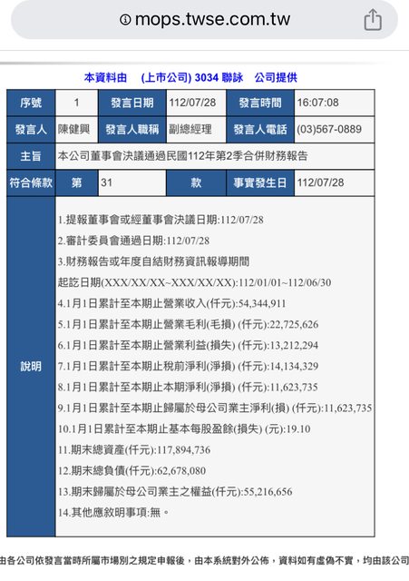 標題[情報] 3034 聯詠 112年第二季合併財報