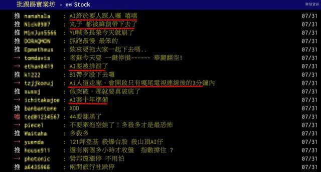 多檔AI個股今天都大幅回檔,大盤也開高走低,成為網友熱議話題(圖/翻攝自PTT) 「鬼指黑啦」、「亞股只有台股在殺…」、「AI拉回就是買 傻傻的」、「大盤翻黑 真的 笑死」、「150點上影線CC」、「AI套十年準備」、「AI終於要人踩人囉 嘻嘻!」 針對網友熱議話題...專家這麼說! AI獲利回吐賣壓非常重 盤勢格局已改變 台股今天開盤先漲171點創高,但盤中很多股票都暴跌。其實這波AI的走勢,創意(3443 )是一個滿重要的指標,先前受惠AI浪潮,創意股價漲了一倍多,結果法說會結果出來今 年獲利比去年衰退,股價也開始一路往下跌,今天更是跌停。 本來很多強勢的AI股,像緯創(3231)今天也面臨跌停,代表整個獲利回吐的賣壓非常重 ;雙鴻(3324)今天開盤後一度觸及漲停板,現在也是翻黑下挫4%,都可以看到整個走 勢的改變,這也在暗示AI真的要進入休息了,取而代之的會是一些落後股,像是網通、碳 權等概念股。 AI回檔修正 大盤也面臨壓力 因為7月以來,AI一直扮演帶領大盤的重要角色,現在回檔修正,台股的人氣也勢必受到 影響,其實今天很明顯就是一個「頭部」的形成,盤面開高走低,交易量又衝得這麼高, 留下170點的上影線,目前看來尾盤也很難再漲回來,並不是一個很好的格局。 拉回就是買?不建議再介入 接下來還有很多企業財報會陸續出爐,如果獲利跟不上股價的漲幅,那就一定會面臨修正 ,即便AI今天拉回的幅度滿大,也建議投資人不要再介入,因為先前很多漲幅大的股票今 天都回得很重,明顯是一個「不好的跡象」,除了基本面可能跟不上股價漲幅,籌碼面也 沒有很好,近來融資增加很多,應該也都會形成影響,投資人要特別注意。 心得/評論: PTT空軍大獲全勝的一天 早盤衝進去買的人真的慘不忍睹 下個月財報就要出來了 潮水一退就知道誰是真AI誰是假AI -- ※ 發信站: 批踢踢實業坊(www.ptt.org.tw), 來自: 223.141.69.1 (臺灣) ※ 文章網址: https://www.ptt.org.tw/Stock/M.1690782364.A.5DE
