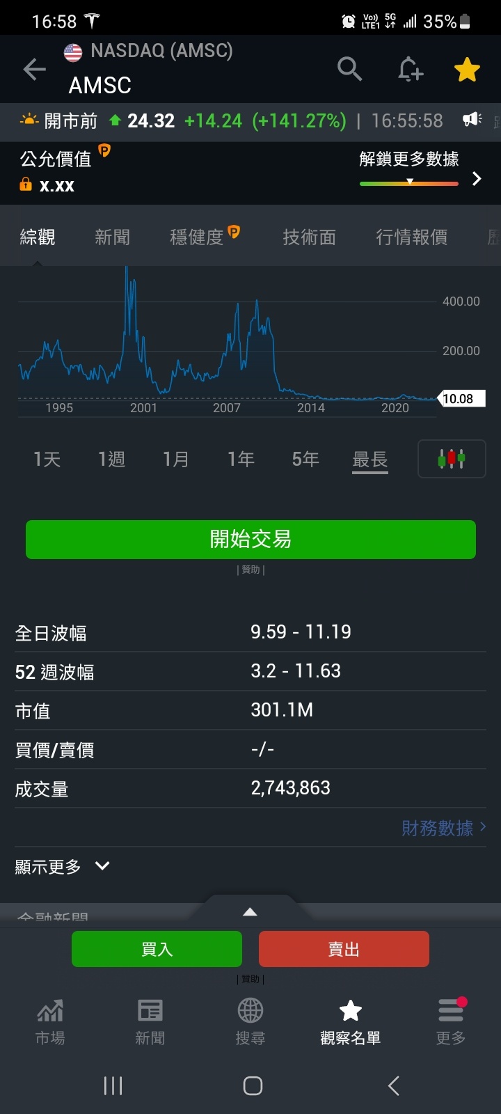 美國超導體公司 AMSC 盤前漲幅一度超過110% 目前漲幅在100%上下,應該是受到今天提出的論文理論可行說法影響 update +140%了 https://i.imgur.com/navgGyD.png