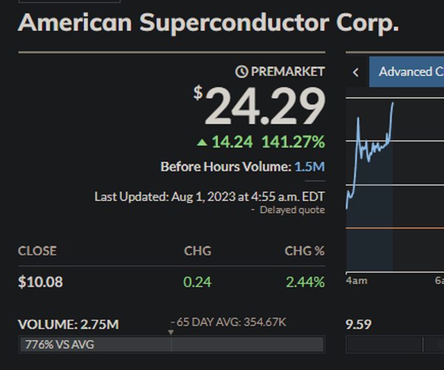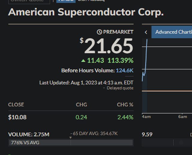 1. 標題:美國超導 AMSC 盤前+110% 2. 來源:MarketWatch 3. 網址:https://www.marketwatch.com/investing/stock/amsc 4. 內文: __update 2__ 中國有人複製出來了 https://twitter.com/Andercot/status/1686286684424691712 ____________ https://i.imgur.com/ui2scYA.png