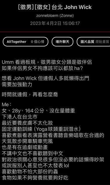 噓 wwa928: 你PO文徵友首要就是要別人看得懂你的內容 61.58.150.86 03/05 15:41