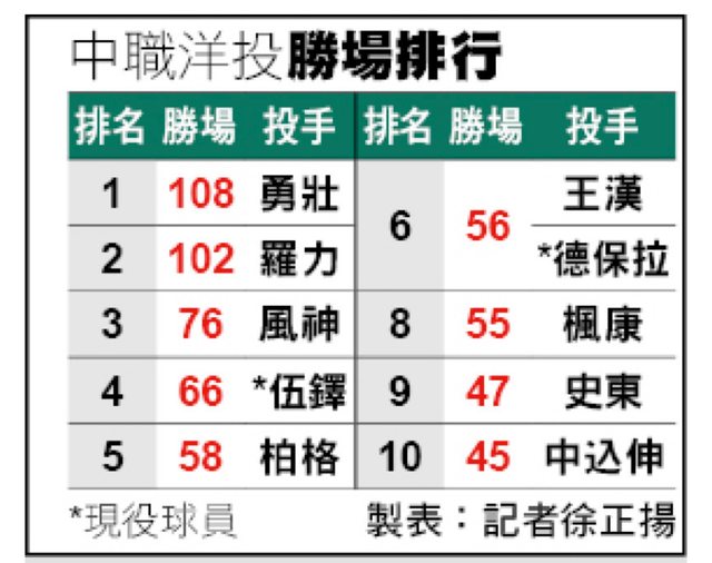在中職洋投勝場排行前10名中,除了伍鐸就只有德保拉是現役球員,保有中職最快速50勝