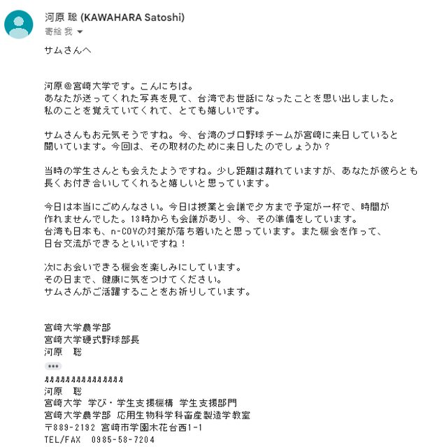 同時還收到了因為檔期喬不攏無緣再次見面的野球部部長 河原 聡教授的來信問候