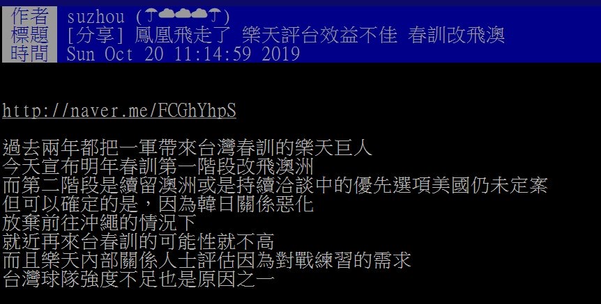 推 yukiss: KBO之前嫌台灣春訓找不到對手熱身賽 春訓後半段還要飛沖繩 02/28 23:13