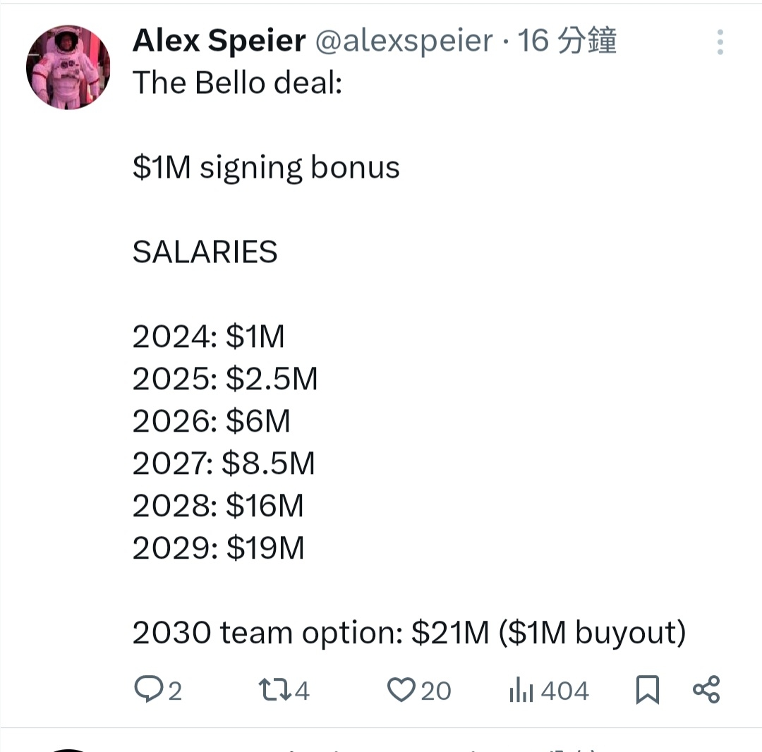 合約長度涵蓋到了他成為自由球員的第1年,還有球隊選項則有可能綁到第2年