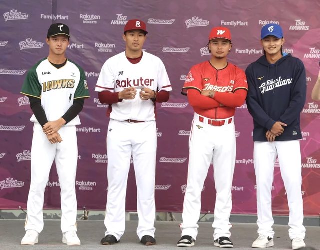 中職四隊下午舉行門票開賣記者會,味全龍林凱威(右二)、富邦悍將李東洺(右一)、