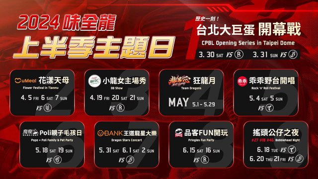 味全龍2024上半季主題日公布!3/30~3/31率先登場的是中華職棒例行賽首場 #台北大巨