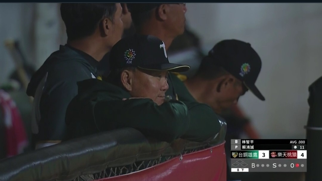 外野手顏清浤在8局下的要命失誤讓對手跑回3分超前比數,總教練洪一中被轉播單位拍到