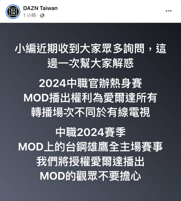 推 CHRush: DAZN的說法就是mod被愛爾達獨播,愛爾達說他們沒有取得獨 03/20 13:45
