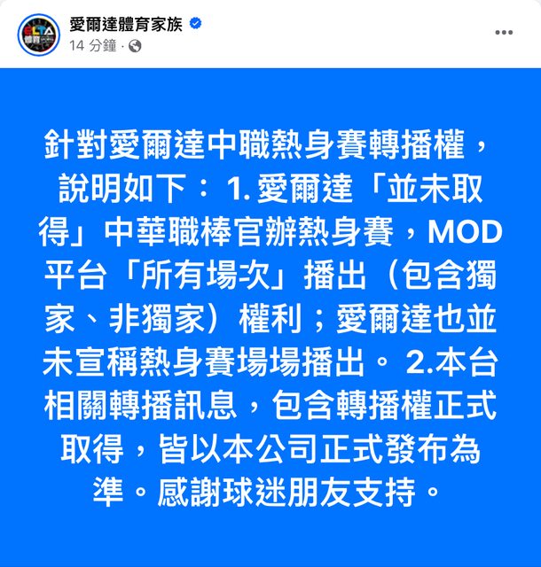 → shinichi: 熱身賽確實目前就ELTA播出中 但台鋼MOD轉播權還未宣布 03/20 14:00