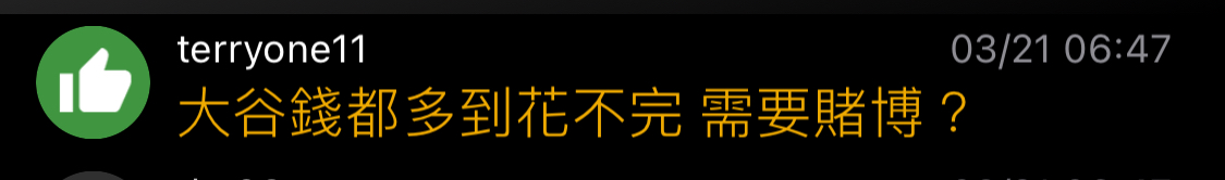 推 terryone11: 大谷錢都多到花不完 需要賭博? 03/21 06:47