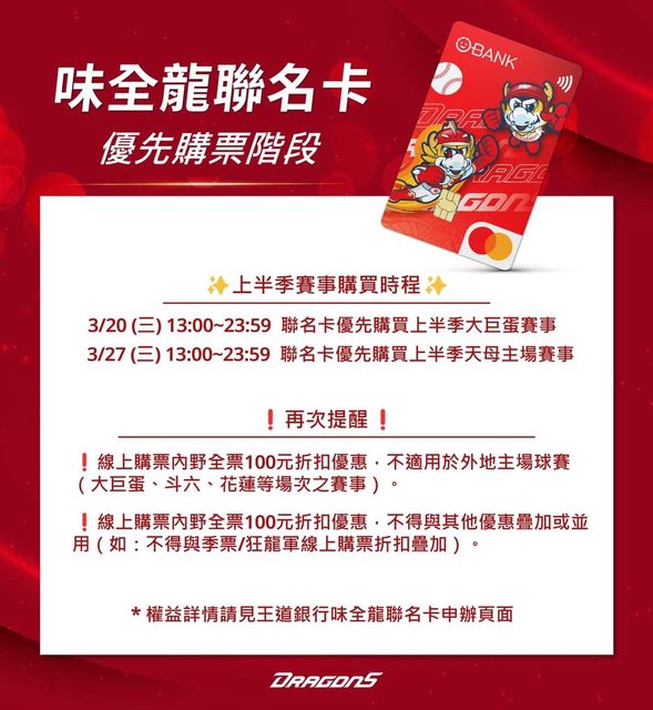 標題[情報]味全龍聯名卡3/27優先購買上半季天母賽事