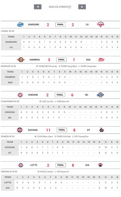 敗:金善起(Kiwoom)(1敗)—4局,5H,5BB,5R(5ER)(79球)