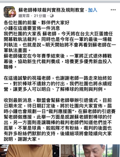 推 jackytw: 祝福蘇建文先生退休愉快 感謝對棒球的奉獻 03/30 15:39