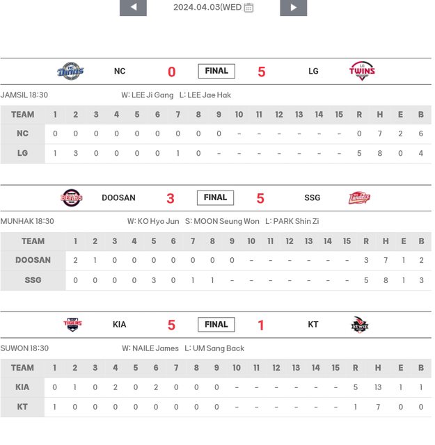 敗:李在學(NC)(1敗)—5局,7H(1HR),3K,1BB,1HBP,