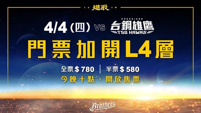 : 將於今晚(4/3)晚上10點起加開販售L4層一壘側座位!