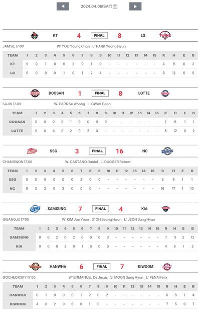 勝:Enmanuel De Jesus(Kiwoom)(2勝)—6+局,4H(2HR),3K,2BB,3R(3ER)(84球)