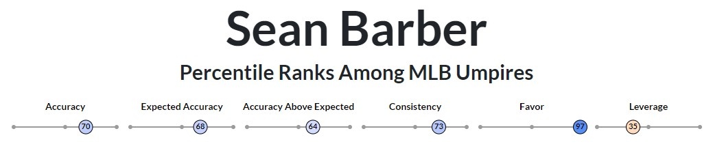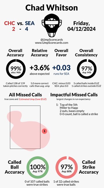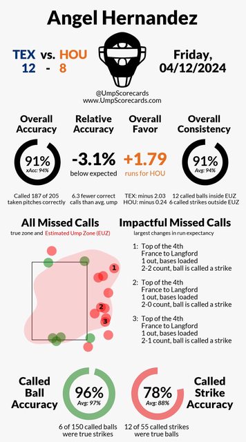 : 他在France對決Langford的打席在兩壞球後連判三顆嚴重偏離好球帶的球好球 : https://streamable.com/j4ltjf : 影片 : https://twitter.com/TalkinBaseball_/status/1779017873886679148 : This pitch was measured outside by 6.78 inches which is the largest miss in : Umpire Auditor history : 第三球偏離好球帶高達6.78英吋則是有紀錄以來差最遠的 : MLB電子好球帶的最大催生者 Ump scoreboard的整理報告出來了 https://i.imgur.com/riZHxSc.jpg