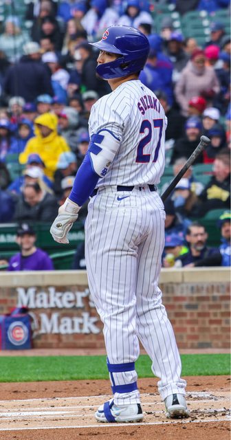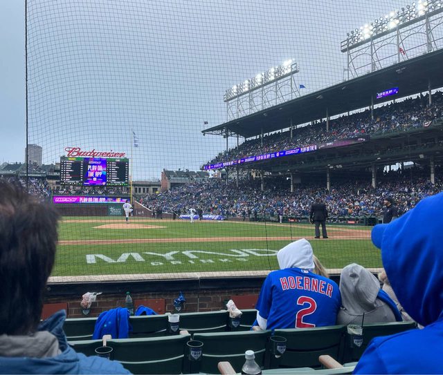 前兩局觀眾大致上都蠻安靜的,可能怕打擾到今永(?) 只有聽到零星幾句的"strike him out." 第一個比較熱絡的時刻是Kris Bryant的第一打席全場觀眾都起立鼓掌致意。 https://i.imgur.com/JvRDGQn.jpg