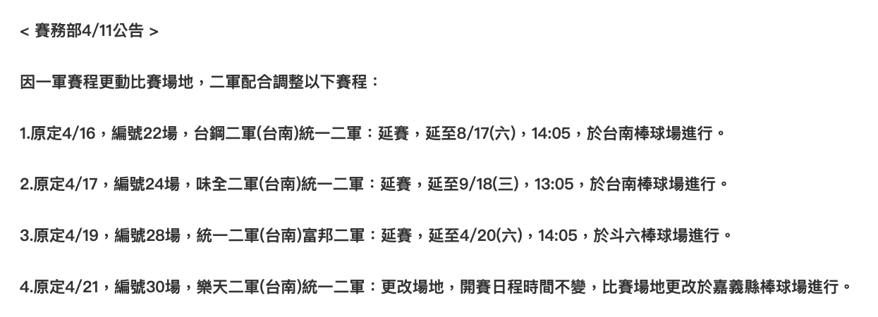 推 CHRush: 統一二軍原定對台鋼延賽然後今天統一二軍去斗六副球場跟 04/16 14:34