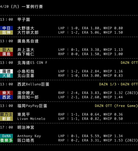 標題[情報] NPB 4/20 預告先發